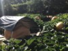 My patch helper deep in the foliage and I think, is she burying vines? No, all done. Is she applying Mycorrhizae or a fungicide? Nope, all been done.