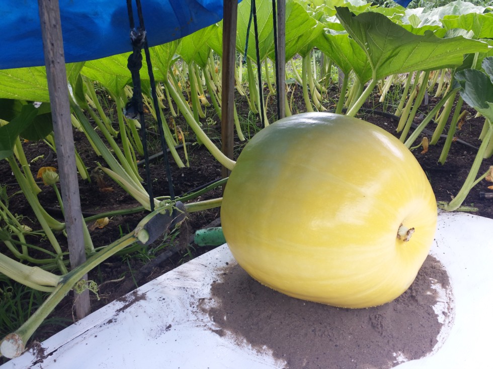 Another view..but in this pic you can also see the vine sling that I installed to help slowly lift the vine on either side as the pumpkin grows in order to keep the stem even with the vine and, in theory, reducing stem stress....or at least I hope it is :)