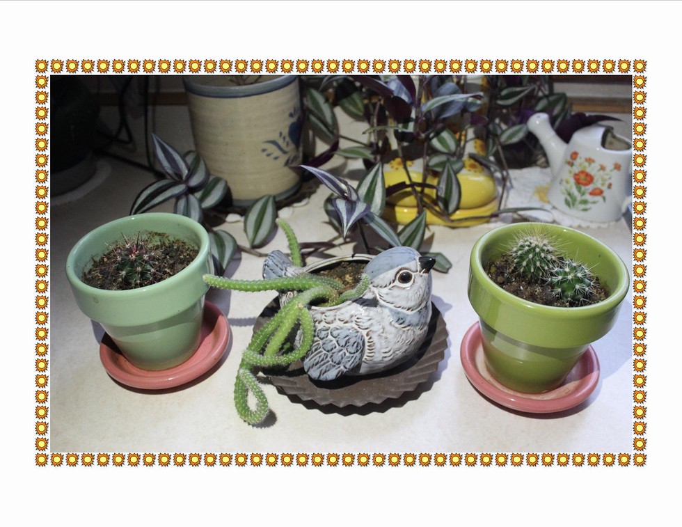 Here are some cactus I have been growing for over four years. The middle in the bird is a cattail cacti (pun intended) sent to me from my sister Therese in Texas. The other three I started from seed. They doubled in size this last summer due to some "pumpkin" fertilizers.