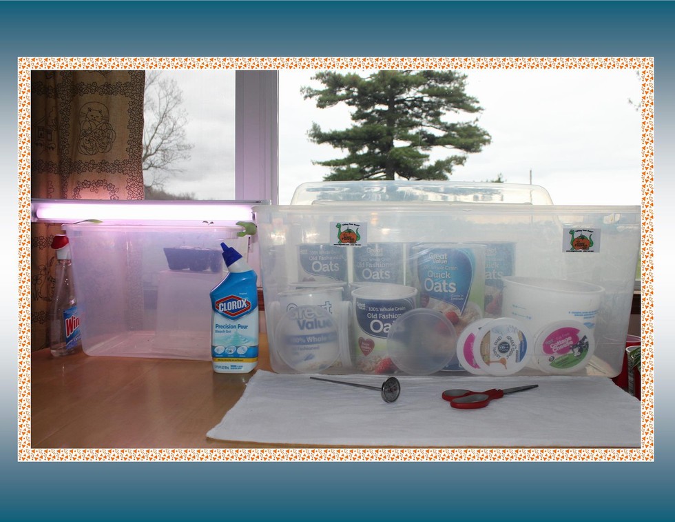 Sterilizing the seed start supplies. The bin on the left has my six tomatoes growing. The bin on the right will be my seed start chamber. With a small ceramic heater outside the covered bin, the temperature in the bin can be regulated to the desired 80-85F.