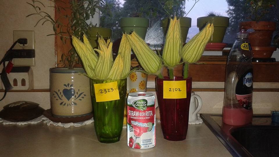 Five plants. Four pollinations tomorrow. The 1916 is already pollinated with the 2323 ... looking good ... except a scar already from the leaf :| The 2323 was already pollinated with the 1916 but opened the pollination and four cuke beetles ... WHAT THE HECK. Today the 2323 had a second self pollination. Tomorrows anticipated pollinations Second 1916 x 2323 First 2032 x 2323 First 17981 x 2323 First 2102 x self everything beautiful on these genetics ... I think :)