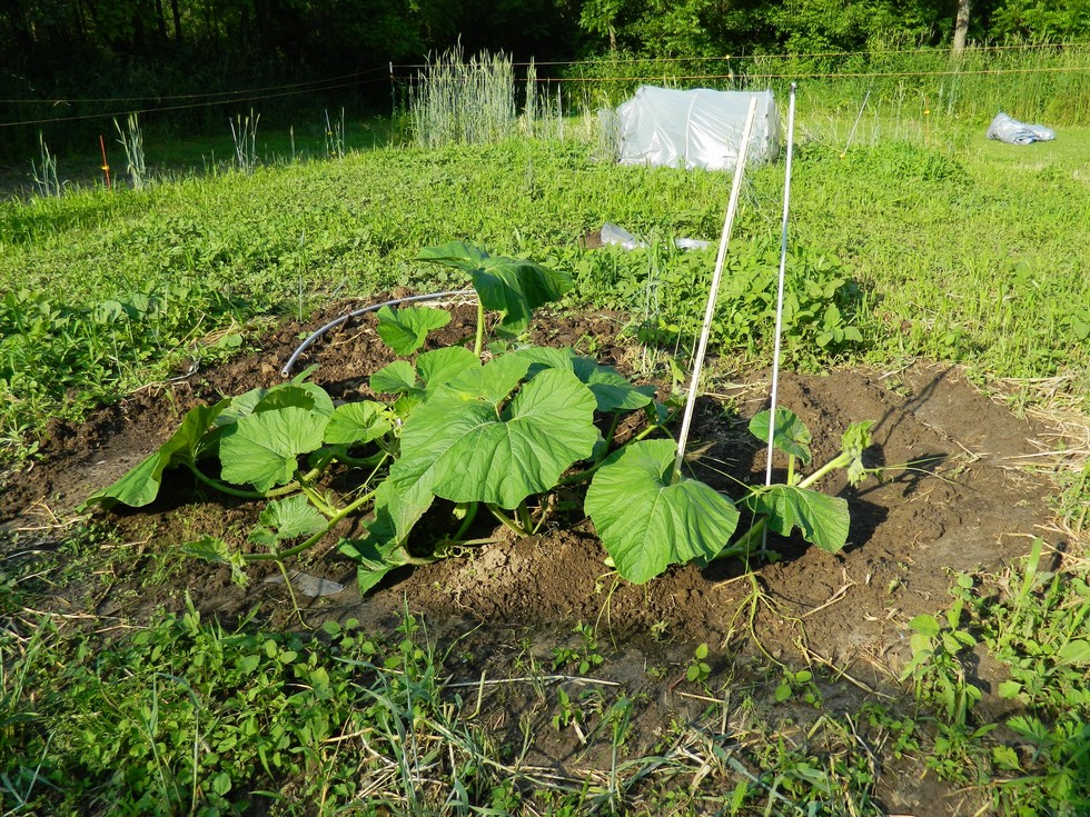 1047.5 McWilliams started growing the wrong direction too. I had another one started with this one but it wanted to grow straight up and split the main. The one remaining hoop in the background is the watermelons. They are going slow as usual for our patch.
