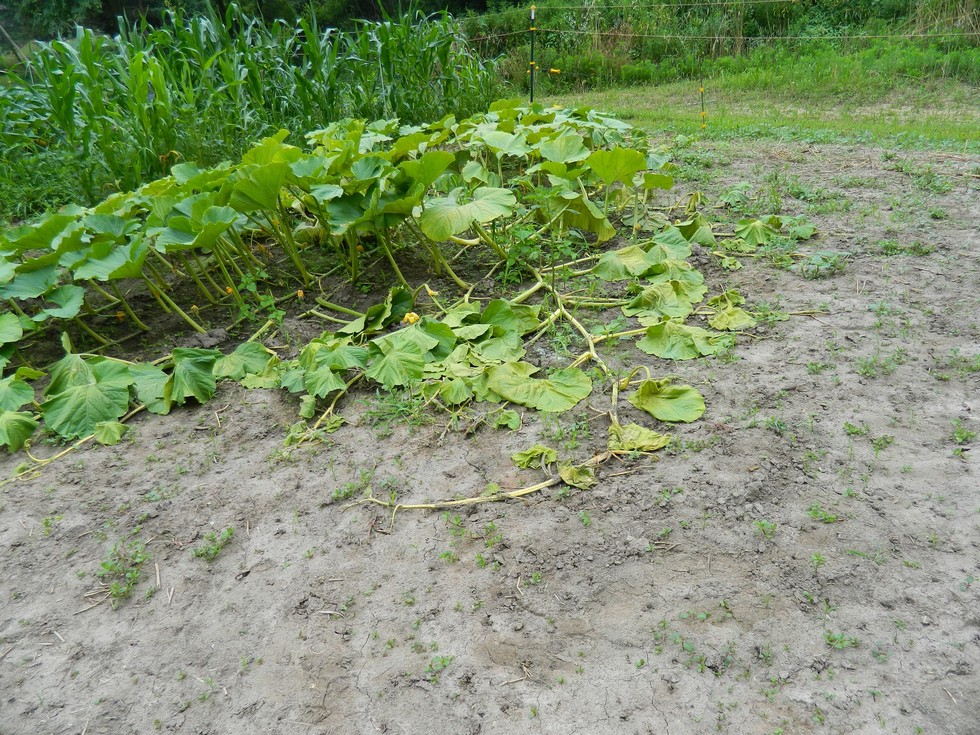 Hidden from the previous view was the 1579 Carlson-Petersen. My attempt to save it failed. It pulled out easily, not rooted well at all. I blame it on poor drainage due to compaction. This spot won't see pumpkins until 2018. will grow the 1579 again, as it started out as the fastest grower in the patch.