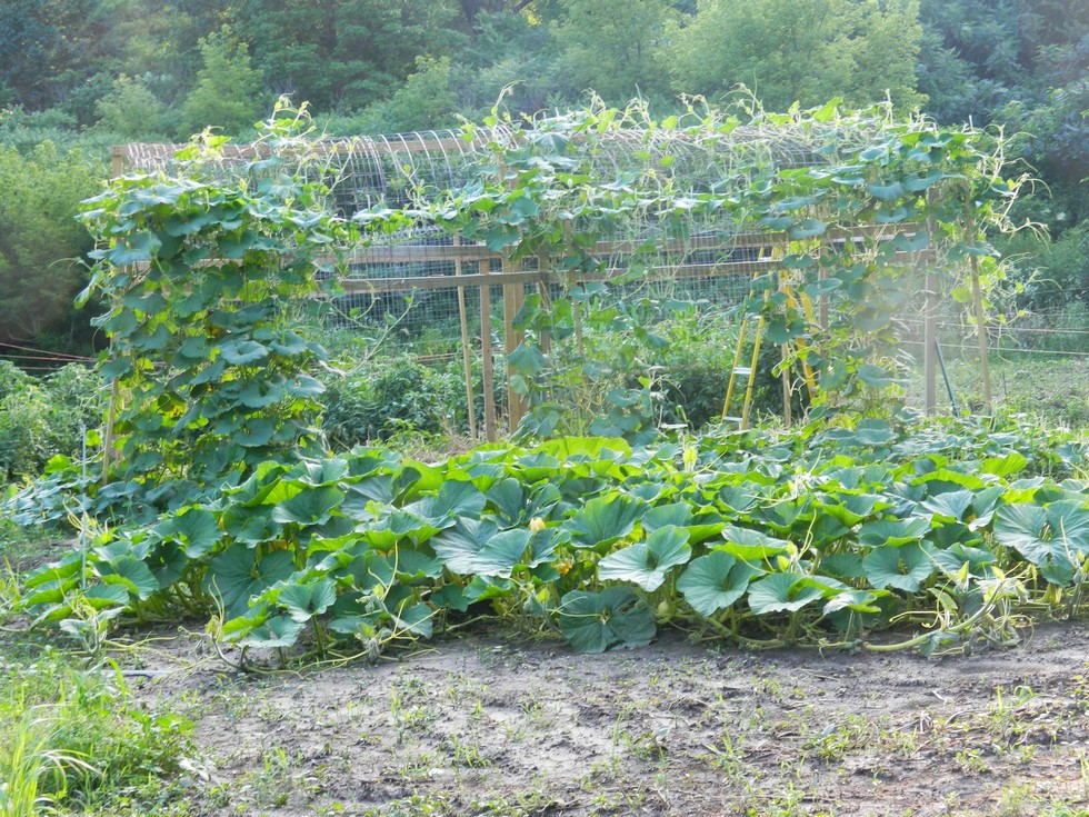1047.5 in the foreground. About the wimpiest plant, an area that got a lot of added dirt and compaction. Long gourde starting to fill up the trellis.