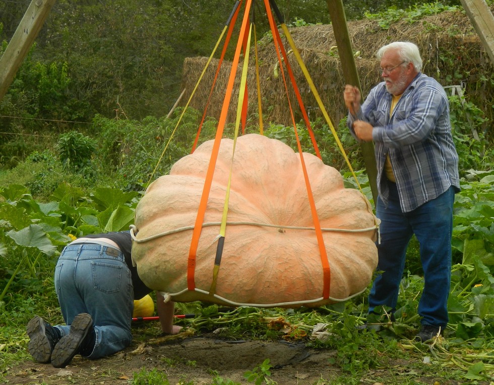 Loading the 1818.5, Jacob checking the bottom. It was OK but the stem was nearly rotted off. But the rot stopped before it got into pumpkin so it is good to go.
