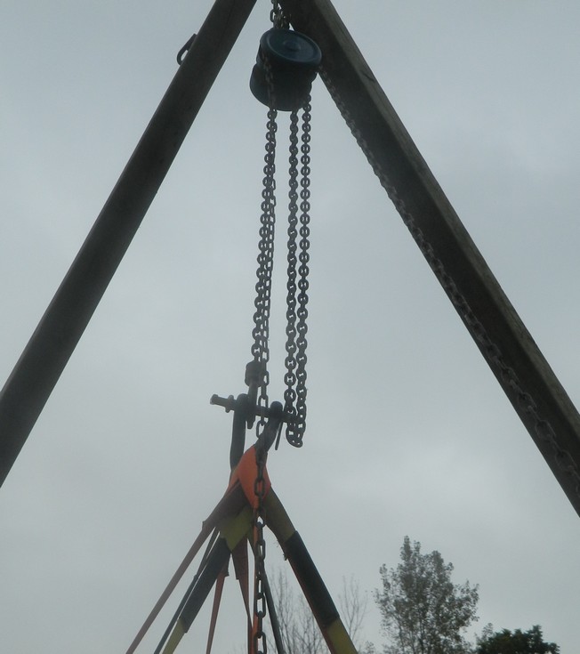 Our lifting setup. 1 ton chain hoist, a heavy tractor clevis, and 9 straps. 5 - 1.5" and 4 - 1" straps, 6' long. With that many straps and the long length, it doesn't out too much pressure on the pumpkin. Just enough to keep the rope from slipping.