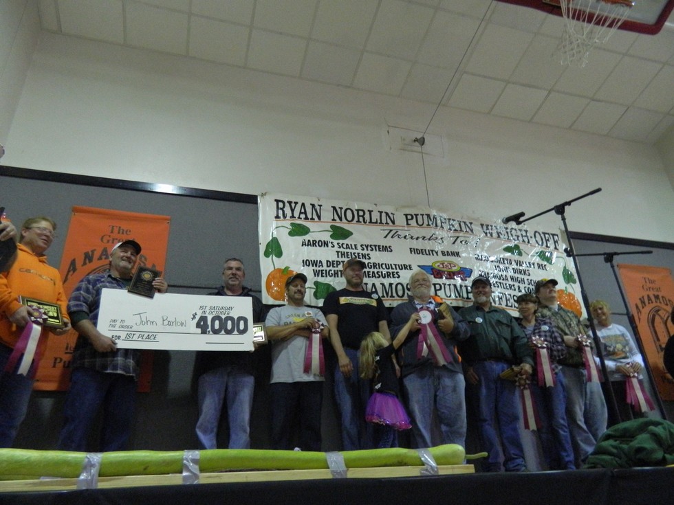 The Pumpkinfest awards. L to P: Rick Jolivette, 209, John Barlow with the big check for first place, Mark Petersen and Dan Carlson, third plus biggest pumpkin grown in Iowa and ugliest pumpkin, Pete Caspers 4th place with his daughter showing me(5th place) her ribbon, Rusty and Cheryl Caspers (Pete's parents and my next door neighbors)7th and 8th. my son Jacob 9th, and Marlene Kuhn 6th and Howard Dill winner.