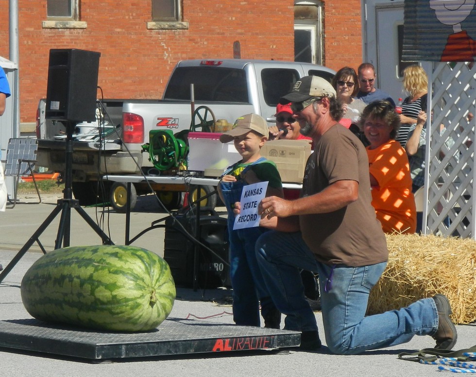 Next on the scale, Dad broke the Kansas state watermelon record. But his growing partner got to share the limelight.