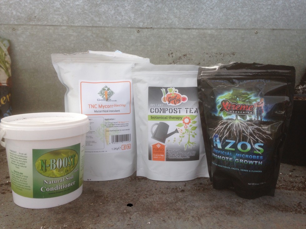Hmmm, some of my seeds being a bit slow to germinate. Think a dodgy thermometer might be to blame so whacked the propagator temp up a bit. Anyway, here's a pic of all the stuff I'm bunging in my potting mix. Didn't use any of this last year (apart from mycco) so lets hope it has a positive effect.