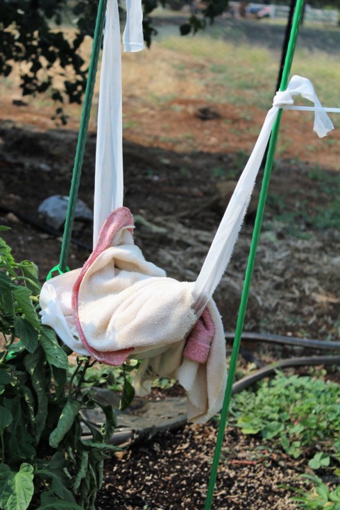 This is protecting it from the brutal heat outside. I do wet the cloth..maybe the evaporation helps? Either way the tomato be over 95F in the 107F or so it's suppose to be today. I know many pumpkin growers here in the NW are sweating bullets this week and not just from the heat.