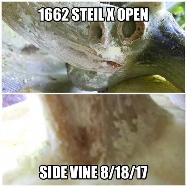 Luke2 stem splits. Sorry the bottom picture is blurry. The split is literally under the stem and I had my phone on selfie mode and couldn't back it away far enough to get it to focus. The other split is away from the pumpkin at least. Both of the stems on this plant split at less than a week old.