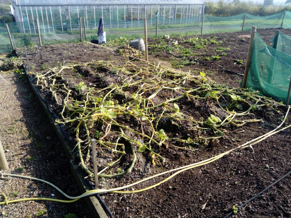 This image isn't from today but did say I would post it a while back. Vine pattern of my 150sq ft 968.9lb pumpkin. I'll attempt to sketch a basic vine layout over it to make it clearer.