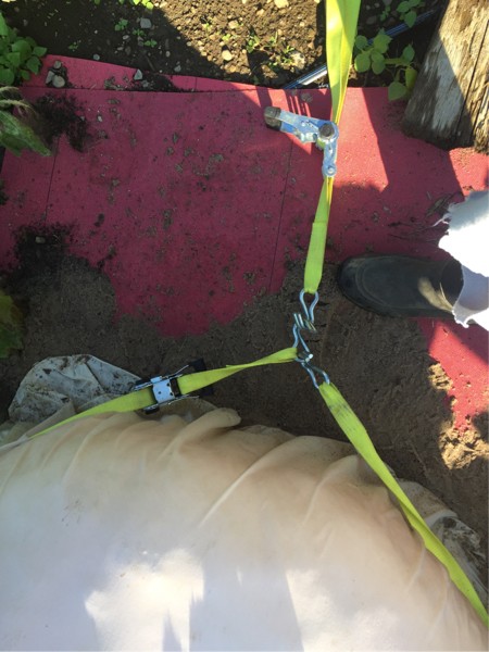 A 15 foot ratchet strap was put around the pumpkin using towels to protect the pumpkin.