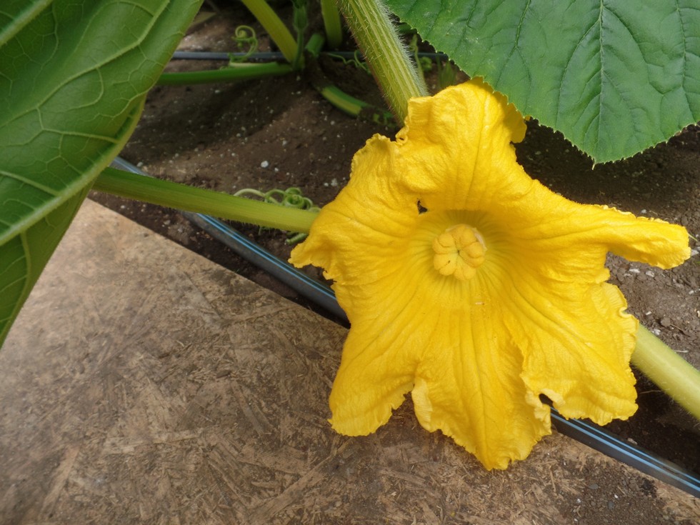 a nice symmetrical 5 lober opened today and was crossed with the 2051 , it was 20 to 22 ft out, and probably the longest I have waited for a 1st pollination ever . hopefully the pumpkin will grow as good, as the plant has