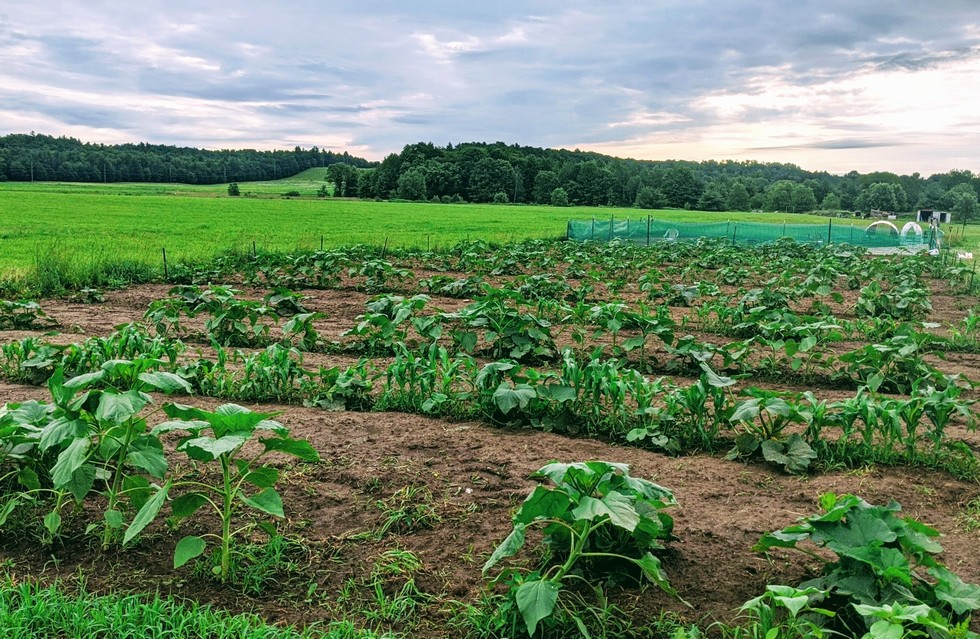 The pumpkin in the 1/4 Acre are doing "GREAT" My windscreens of Giant Sunflowers and Earth Tones and Green Oaxaca Corn, along with the two rows of sweet corn are doing their jobs