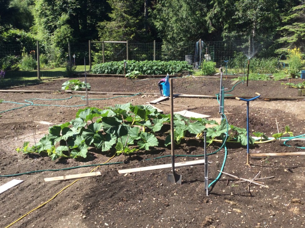 In the back left are 2 prizewinners pumpkins sharing a spot (thanks Glenna and Richmond Dave for the seeds) and to the right you can see the leading edge of the Wallace plant that has decided to kick into high gear.