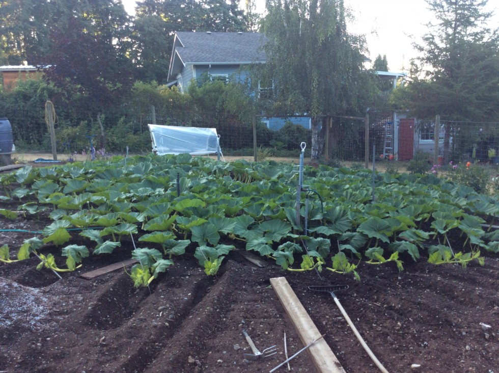Hooptie hut back in action and will keep the growing pumpkin dry. We will install some remay or shadecloth on top to cut down some of the heat.