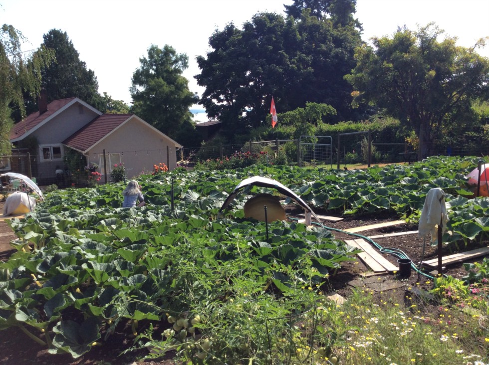 My patch helper deep in the foliage and I think, is she burying vines? No, all done. Is she applying Mycorrhizae or a fungicide? Nope, all been done.