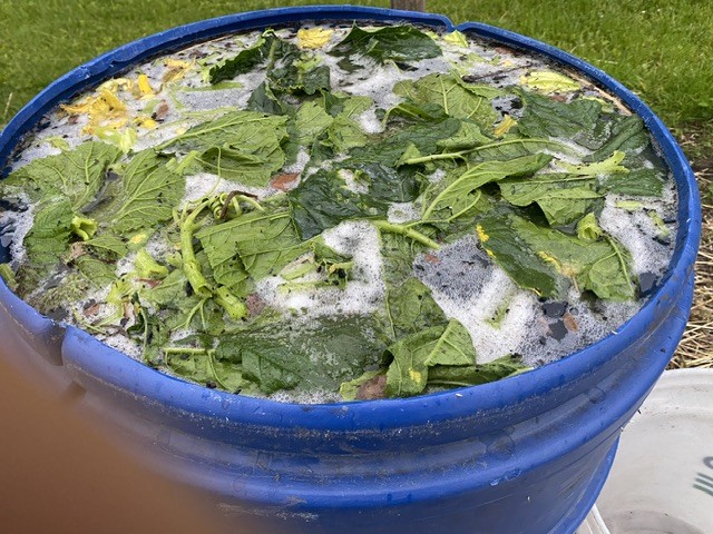 JMS solution ready to put on next years patch. Pumpkin leaves were added to grow microbes that pumpkins need