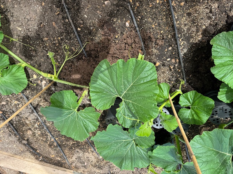 If you can send one of those secondaries from the pumpkin side over the top of the main vine to give yourself more space for the pumpkin. You don't want any of the vines touching the pumpkin because for some reason, and I don't know why they can infect the pumpkin.