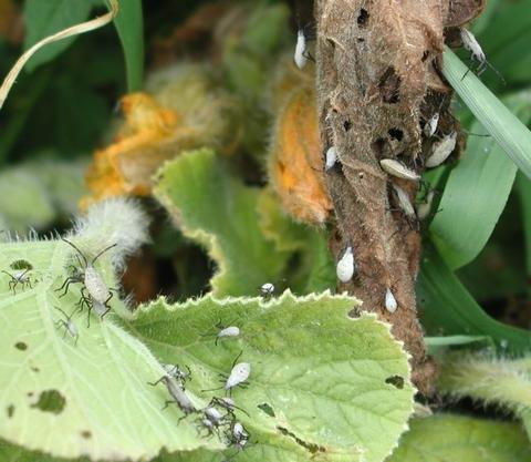 Extreme case of squash bug infestation. These are immature squash bugs, also known as nymphs.