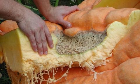 This is a cross-section of GODZILLA's blemish where it split. The pumpkin was 8 inches think in most places, and only 1 inch thick below the blemish.(Groundhog damage)