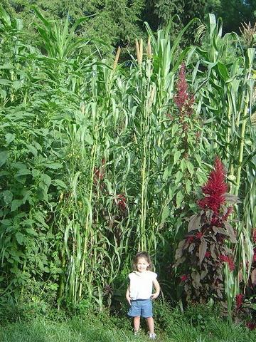 Picture of my 2 year old daughter, Ayla, standing next to pearl millet over 12 feet tall.
