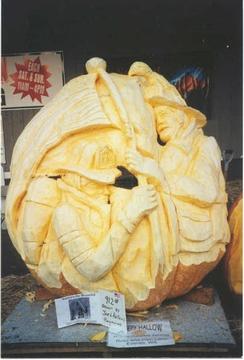 Here is a picture of a 2001 Holland 912# pumpkin that they had carved at the Fair by Pam and Russ to depict the Firefighter Memorial. We think they did a great job..