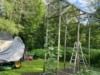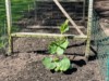 The trellis next to the greenhouse has the 152 Yohe long gourd. This plant started out aggressive and is a little over 4 feet up the trellis today.
