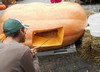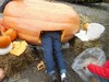 Mike�s pumpkin was next on the seed harvest list. I am not sure if this picture does the pumpkin justice, but this was a very impressive pumpkin. It was tall and wide and also had great orange color. What I have heard a few growers refer to the orange speckles as �Calai Speckling� which is in honor of the late Fred Calai who was known for orange pumpkins. This was a very impressive pumpkin and made for a great display.