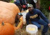 Here is Andy Wolf making the initial cut into the pumpkin. Even though it was a cool day, for Andy it was getting warmer as he was tiring to cut the opening as this was a very thick pumpkin. We had some discussion on the best location and there was no clear ideal spot, so this one was selected.