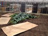 Finally things are happening in the patch and half of the soil is in. You can see our new way of walking around the patch on 4mm 6x4 sheets of plywood.