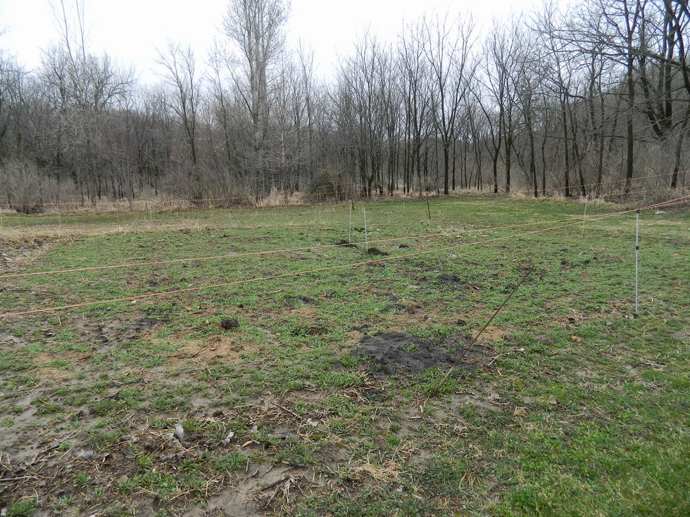 Rye cover crop is growing but the deer keep it mowed short. The dwarf Essex rape that was planted with the rye winter killed just like is should have. This plot was sweet corn last year. I mowed down the stalks and tilled them in along with a truck load of grass clippings. It got a Ford Ranger load of composted cow manure and 2 truck loads of field pumpkins bought for a dime each added for organic matter. It is closest to the creek and gets more sand when the creek floods. Floods have become rare since a large dam was built upstream around 15 years ago.