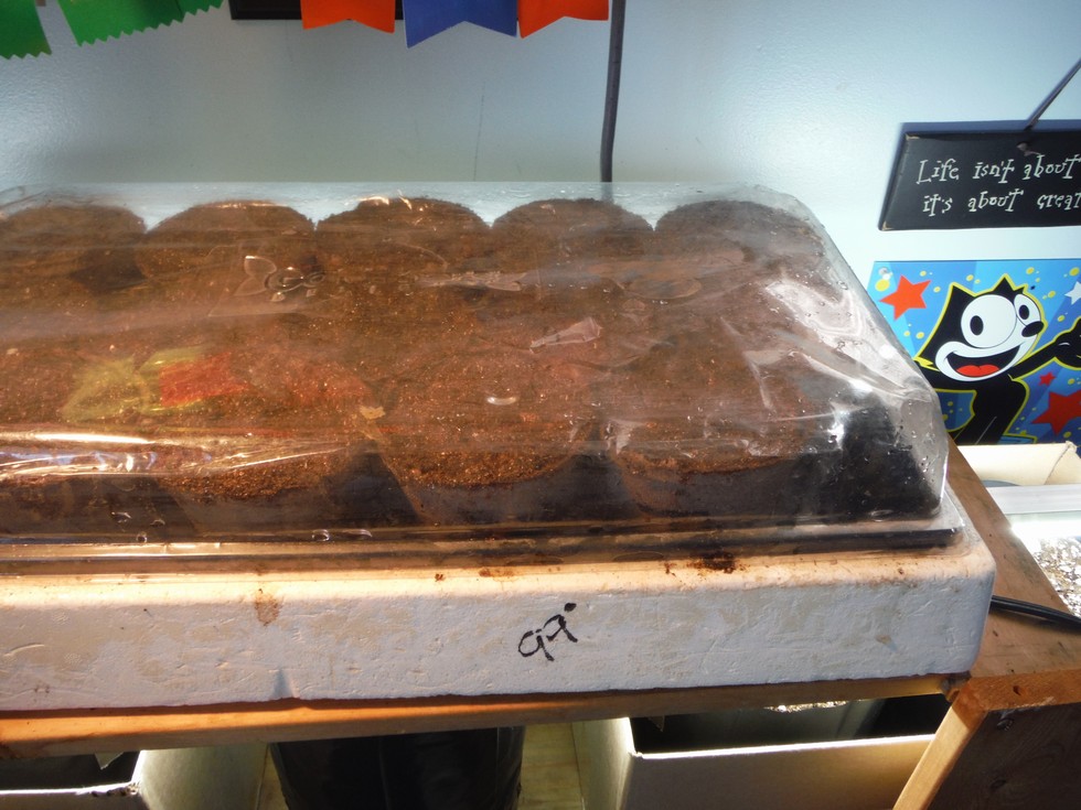 I laid saran wrap across the top help keep moisture in the peat pots.I also sprayed the inside of pots with water to dampen.I figured the dry pot would suck the moisture out of the seed starter mix.You want them moist not wet.I will remove saran wrap in 2 days.Let the Fun Begin!!