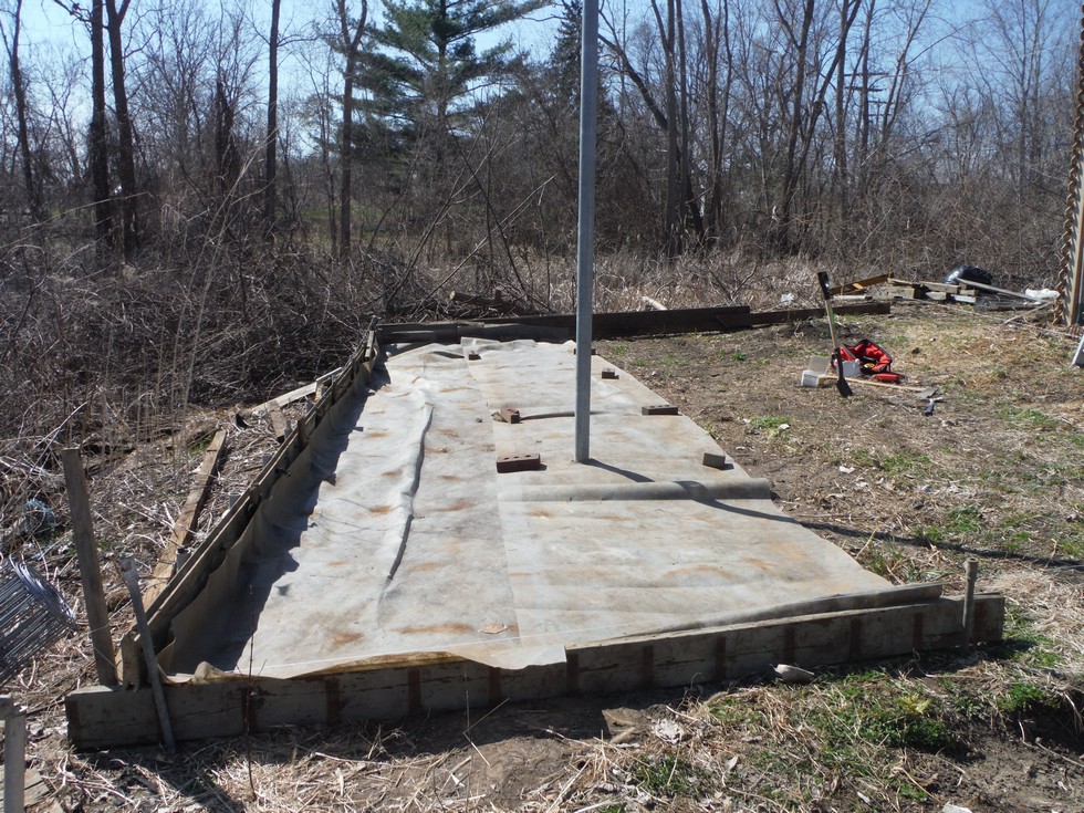 Raised bed for Watermelons the 260.5 & 291 will go in here.Basicly this will prevent soil from washing into wetlands.It is a half raised bed.I dont see the need to complete the highside.The pole was Sarahs (German Sheperd)post from 2011.weed barrier to slow down wild vines growing along the edge of wetlands.