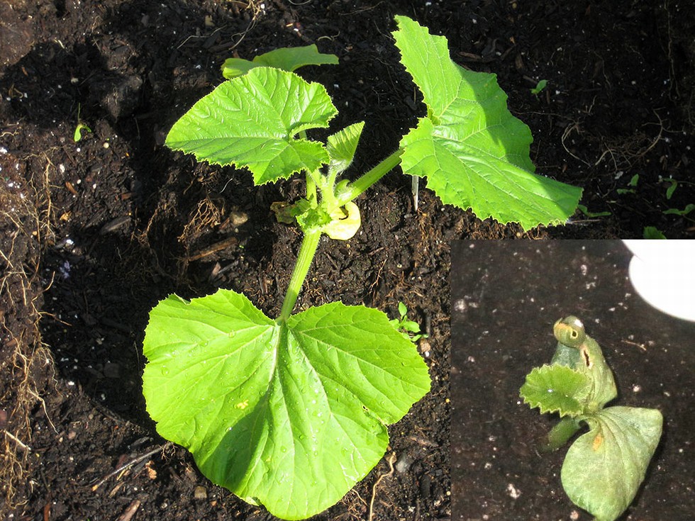 This is a backup 2009 growing in a smaller patch with none of the first class amenities of the others. No hoop. No cables. Coming along. As a reminder, this was the ugliest seedling of the lot and I have inset a photo. Scarred, curled up cots with holes. Would help if the weather would heat up.