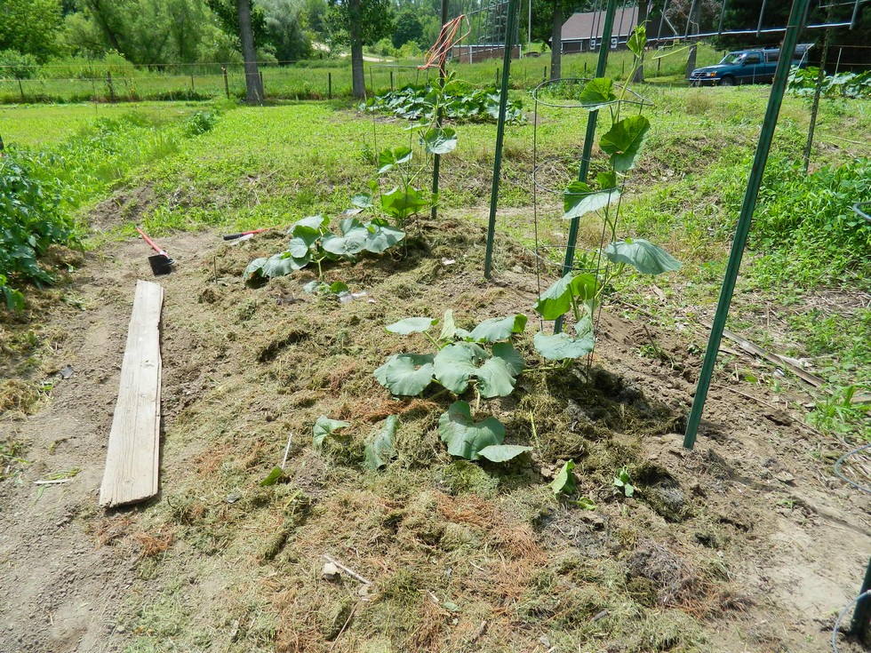 The Stivers and Ansems gourds after the morning treatment, A walking board added to prevent compaction on what I hope will be a huge root system. In the background you can see how the pigweed and foxtail are doing well in the pumpkin patch. If the wind would calm down I could spray some glyphosate. Those are the Scherber pumpkins and both have females 8 to 10' out on the mains.