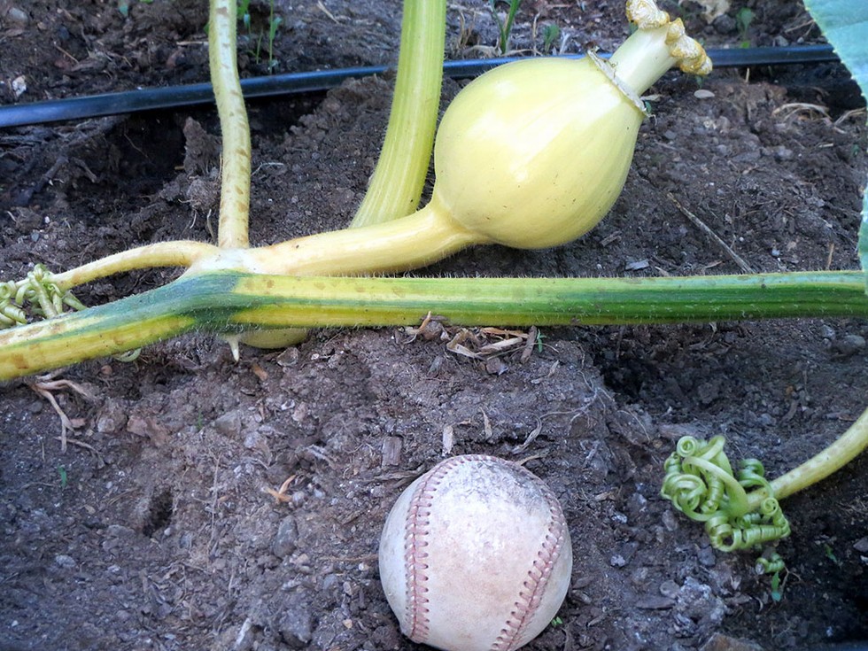 1530.5 Breznick x 2009 Wallace. 4 DAP. Baseball size and shiny. Starting to lay down. 11.5 feet out on main vine. Symmetrical 6 lober. Got to consider this summer solstice pollination.