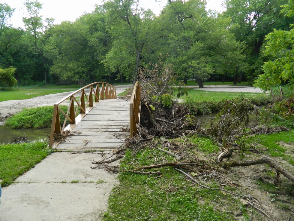After the creek leaves my place it goes through the corner of one hobby farm and into Wapsipinicon State Park. In the park it piled up trees against the foot bridge and buried the road at the "upside-down" bridge and lots of grass areas with sand and mud. I guess I'm lucky my garden wasn't covered with 2' of sand.
