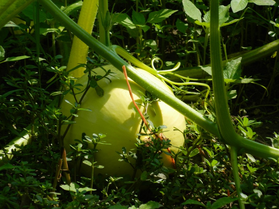 Submarine's first pollination is now close to volleyball size. Nice shape, and I hope it has its mother's great color.