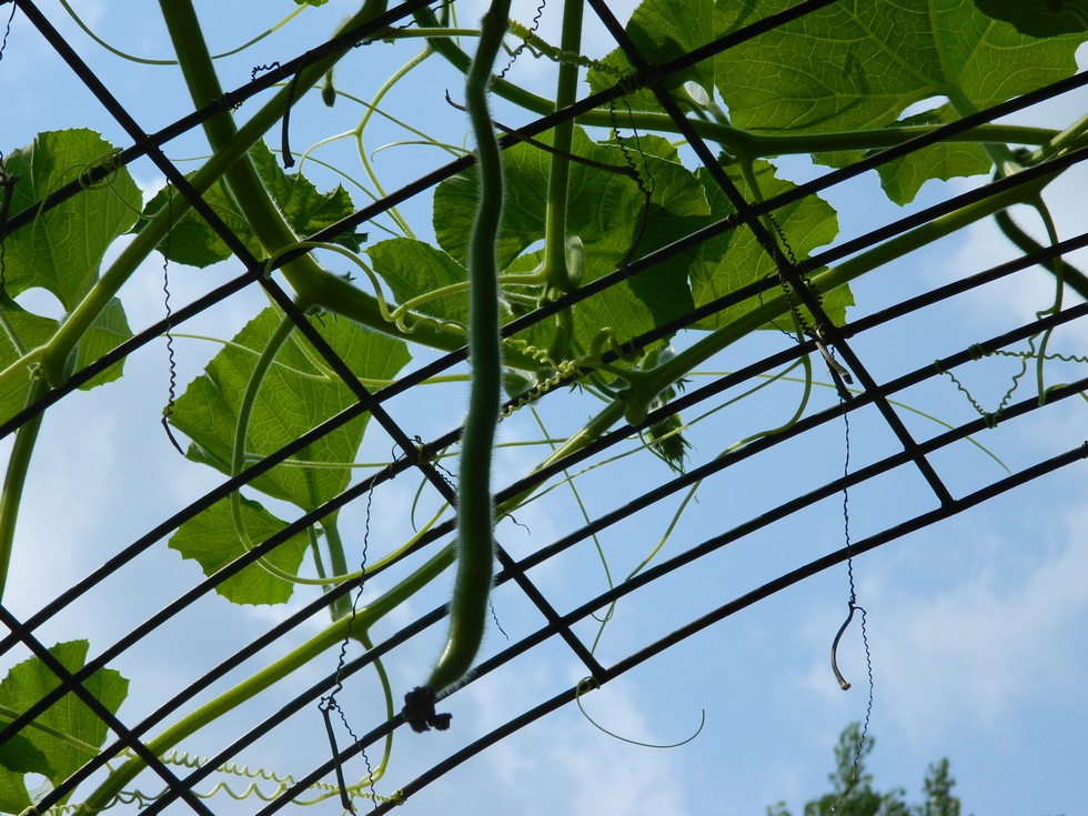 I like the looks of the gourd on the left. Long, skinny and at the top of the trellis. This is on the 129.13 Young. The 114.5 Stivers has some gourds started, and the 139.25 Ansems will have the first female bloom in a day or two. Still waiting for females on the 137.5 Ansems and 115.13 Wright to get females. Will be time to start foliar feeding soon. I'm real optimistic for the gourds this year. I got much better soil prep this year, and the plants are about a month ahead of last year. They can grow while the days are longer instead of the shorter days in September like last year.