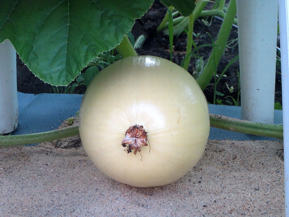 "So from my personal point of view, get an ugly girl to marry you" - Jimmy Soul. In an April 29 post, I showed 2 2009 seedlings that I started. The ugly seedling on the right was so gnarly and beat up that I didn't think it would make it. So I planted it at the edge of the big patch in about 100SF. No hoop. No heating cables. No protection on the cold nights. Nothing. This 2009bX1530.5 fruit is at 8.5-9ft out on the main and measures 25in CC at 12 DAP. The pretty seedling is a massive plant today, got the 750SF patch plus all the amenities. It also has a 12 DAP at 25in CC this morning. This will be interesting to watch. One looks orange and ribbed. The other is cream and smooth.