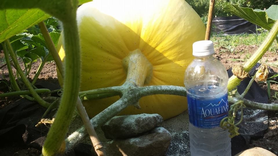 The stem end of the 754 Schweigert. A beautiful pumpkin. It was pollinated on July 6th so it is still very young. The plant is absolutely the saddest plant I have ever seen but the pumpkin keeps putting on impressive daily gains which is GREAT!
