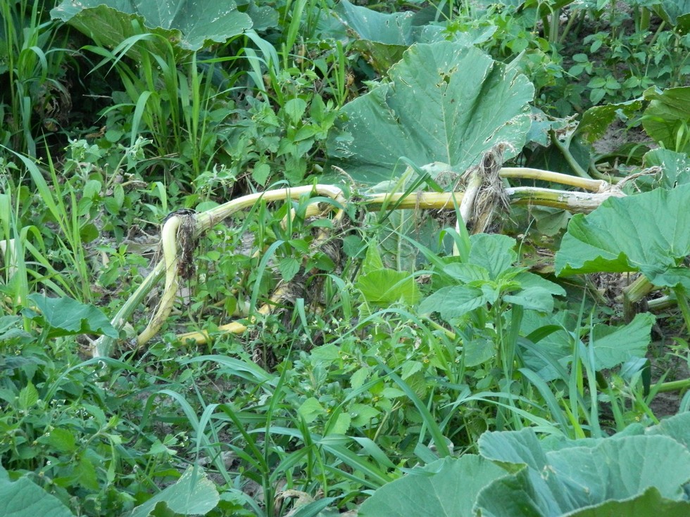Ever wonder what the bottom of your main vine looks like half way through the season? I hope you don't find out like this. That area is weedy because it is a tangle of secondaries and I don't want to hurt them any more. I can make up for what the weeds take with water and fertilizer.