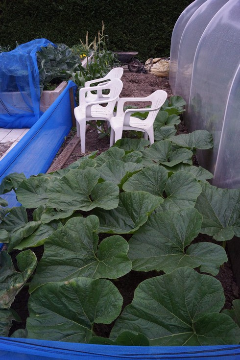Half the area outside is full now and terminated. The main vine is just appearing outside at about 29ft. There is 60ft2 still left to fill, then the patch will be complete. Thursday and Friday of last week were scorchers and caught me off guard. Had no protection over the new growth outside and so you can see the damage in the bottom left hand corner. Lesson learnt.....so now we have musical chairs racing across the patch.