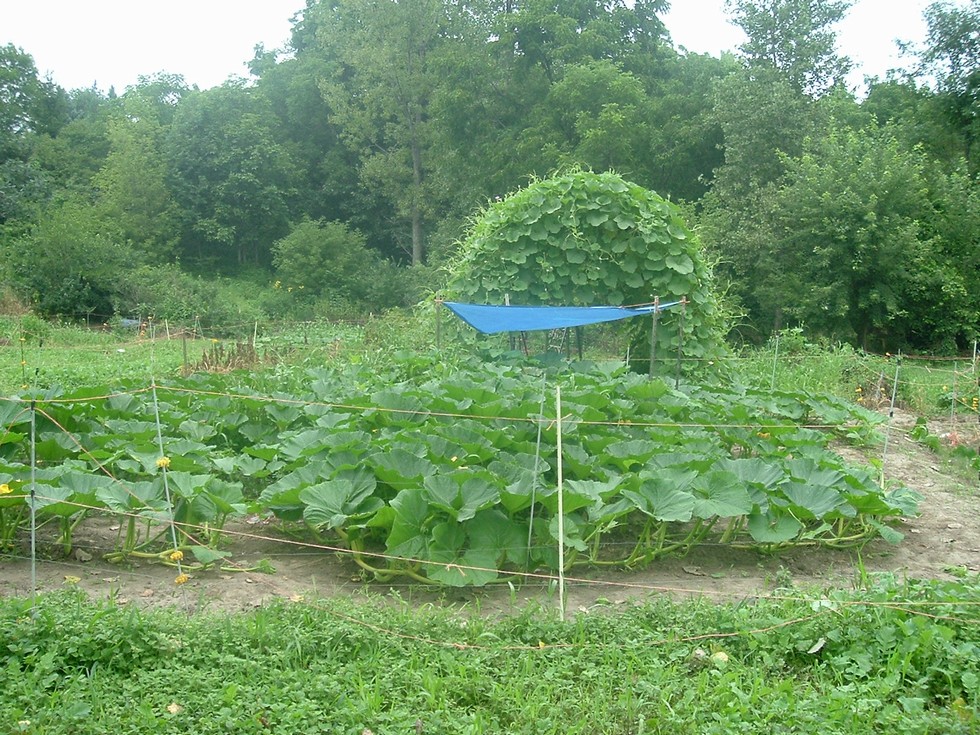 Survivor plant this afternoon with long gourd trellis in the background. It sure is an improvement from the photo I posted on June 30. Survivor is covering close to 700 square feet, and I am just leaving paths in to the stump and fruit. Long gourds on the 129 Young are 105" and 109" and slowing down. I hope that with some extra watering and feeding I can get them to at least 120. I have one on the 115 Wright that is 55" with at least 2 weeks of good growth left in it.