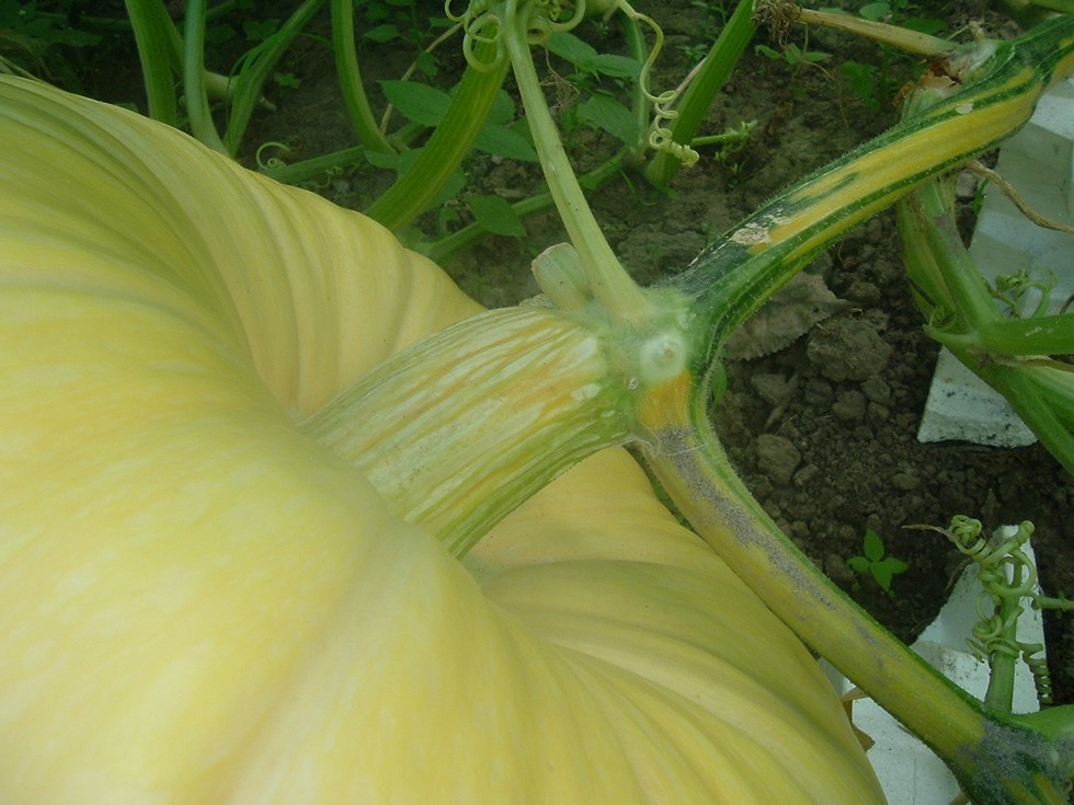 Stem on Survivor looks good. I keep moving it a little at a time to prevent stress on the right side. Soon it will be too heavy to move. If necessary I can cut that end loose later in the season. There really isn't much plant past the pumpkin.