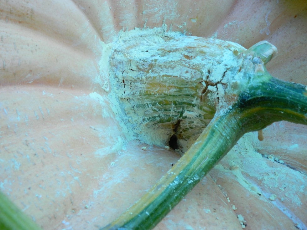 Stem split on Survivor. I have seen worse, but this pumpkin is becoming a reverse birdbath. The stem is pointing up and water collects around the split. It took several paper towels to soak it up. The split only goes about 2" deep but I don't want rot to start.