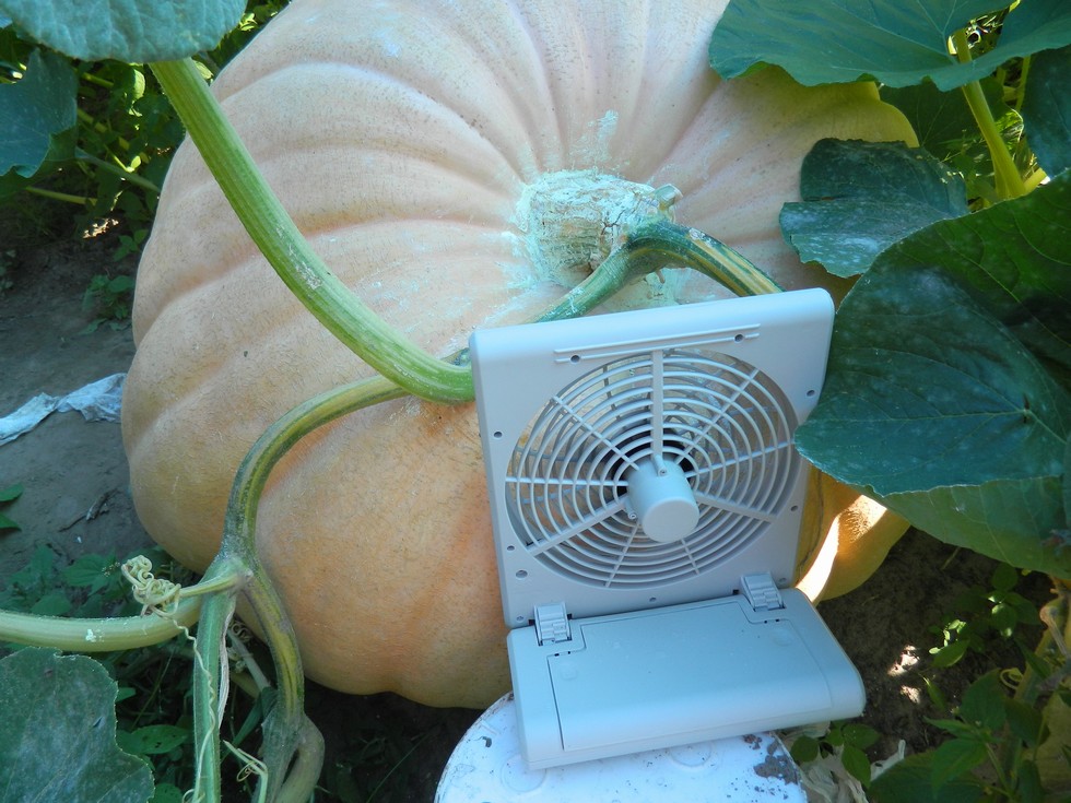 I got a battery operated fan from my daughter and have it set up to dry out the split. Once it is dry it will be filled with sulfur and sealed with quick drying latex caulk. I will try to get another water shedding cover over the stem. I learned while watering that the shade tarp leaks a little, and it gets condensation on the bottom in the morning. If the crack widens I may have to re-caulk. I found 2 small pumpkins hiding in the weedy vine tangle left by the flood and eliminated them. So far growth for August has averaged 19# per day. Today is hottest day of the year, around 92 and sunny.