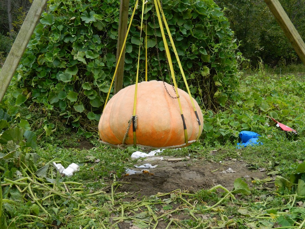 Loading day for Survivor. The stem split never got into the cavity and it thumps like a rock. Jacob helped me move the tripod over and lift the pumpkin. It feels heavy on the hoist. Before we get it too high we need to check the bottom and brush off the sand.